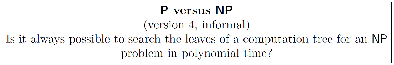 Nondeterminism captures parallel search: nondeterministic programs can explore all possibilities simultaneously. The question is whether this provides exponential speedup over deterministic search!
