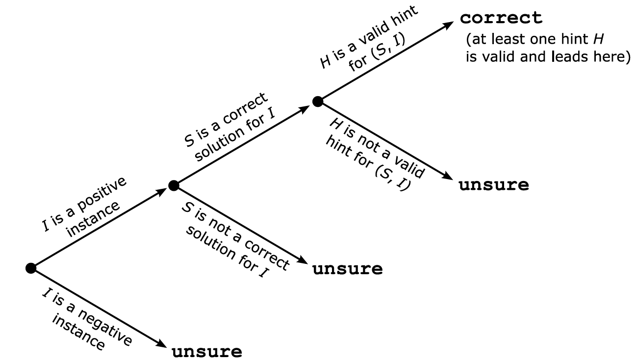 correct or unsure (never incorrect!)unsure when the “quick check” is not clearunsure not incorrect?The unsure output reflects fundamental asymmetry: verifiers can confirm correctness but cannot definitively reject; they are “helpful” but not perfect. This asymmetry mirrors nondeterministic computation where positive solutions are found but negative instances only yield no!