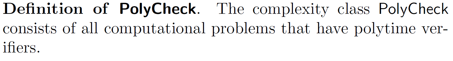 PolyCheck captures “easy to verify”: these are problems where checking a proposed solution is polynomial-time, even if finding the solution might be exponential-time. This is the class of problems where verification helps!
